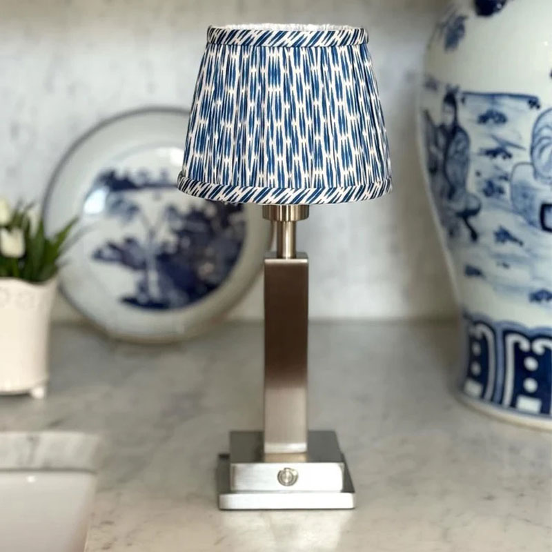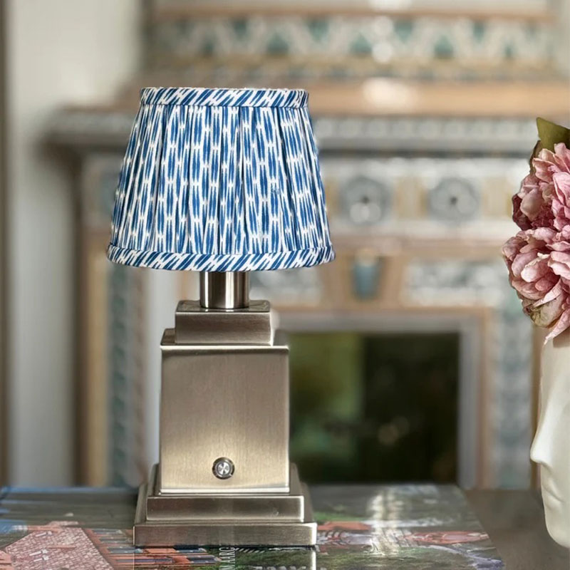 Blå Ikat lampeskjerm fra Von Norten tilfører rommet liv og karakter med sitt unike mønster. Den skaper et mykt, behagelig lys og passer perfekt sammen med lampeføttene fra samme leverandør. Du kan enkelt sette sammen en stilfull og personlig oppladbar lampe.