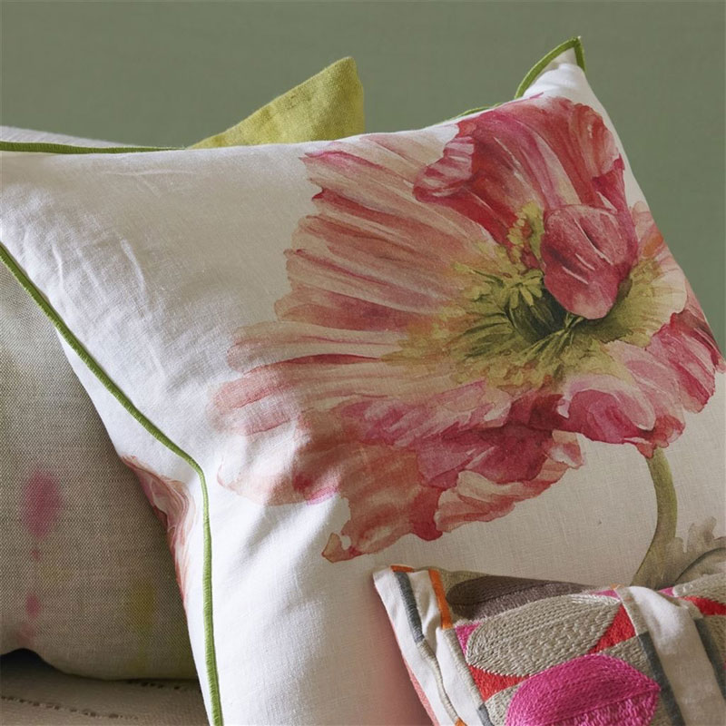 Coquelicot Coral Pute fra Designers Guild er en 50 x 50 cm kvadratisk pute i 100 % lin med myk duninnmat. Den har et dekorativt valmuemønster i varme korall- og ferskentoner.