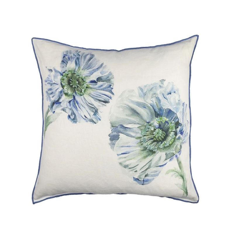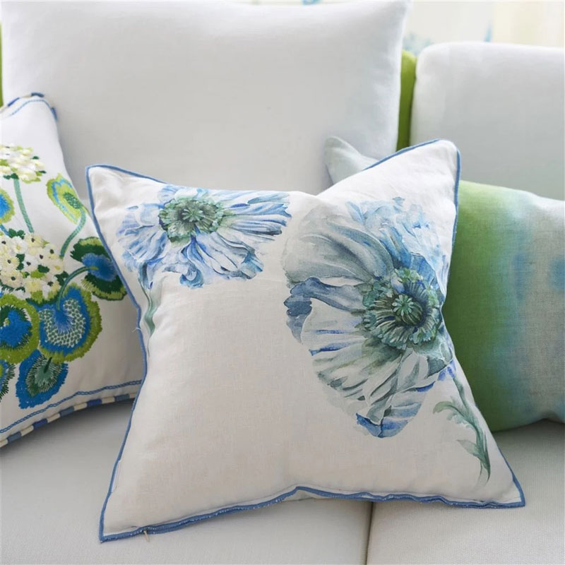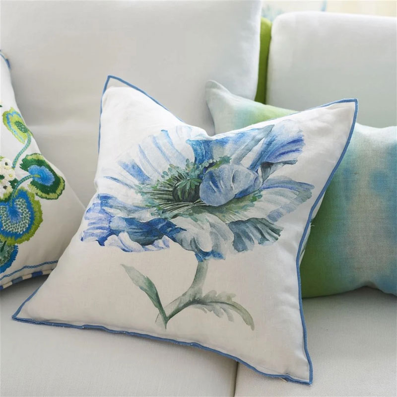 Coquelicot Delft Pute fra Designers Guild er en 50 x 50 cm pute i 100 % lin med myk duninnmat. Den har et dekorativt valmuemønster i blå og grønntoner.