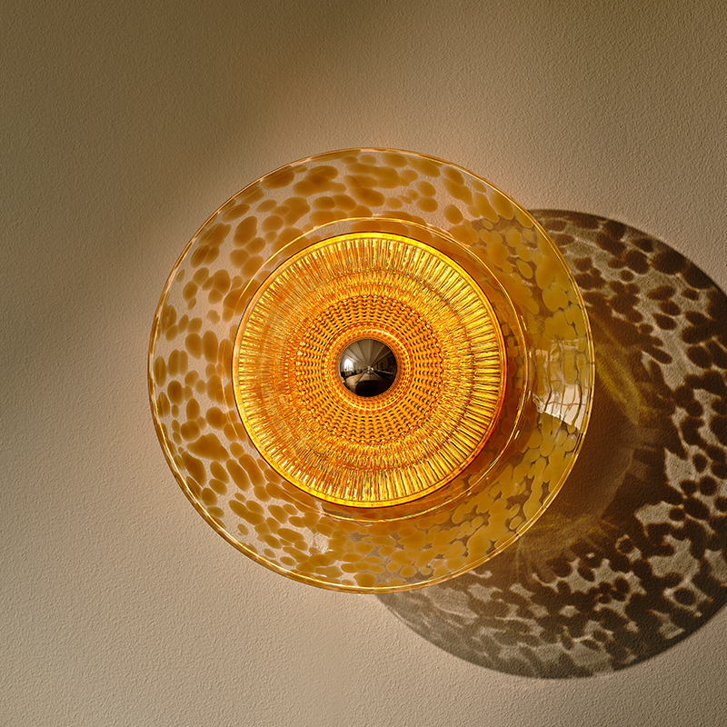 DiscoRama vegglampe i Amber fra Design By Us gir et dristig designuttrykk og er et showpiece. Den store, sirkulære glassplaten har et dypt, skilpaddeskall-inspirert mønster som umiddelbart fanger blikket, mens de lagdelte glasselementene skaper en livlig, nærmest hypnotisk visuell effekt i lampens kjerne.
