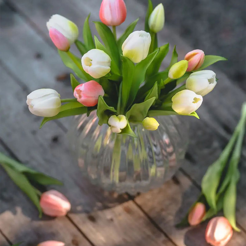 Kunstig tulipanbukett fra Alot består av 5 hvite tulipaner med naturtro uttrykk. Buketten er 30 cm høy og gir et friskt, blomstrende preg året rundt, helt uten vedlikehold.