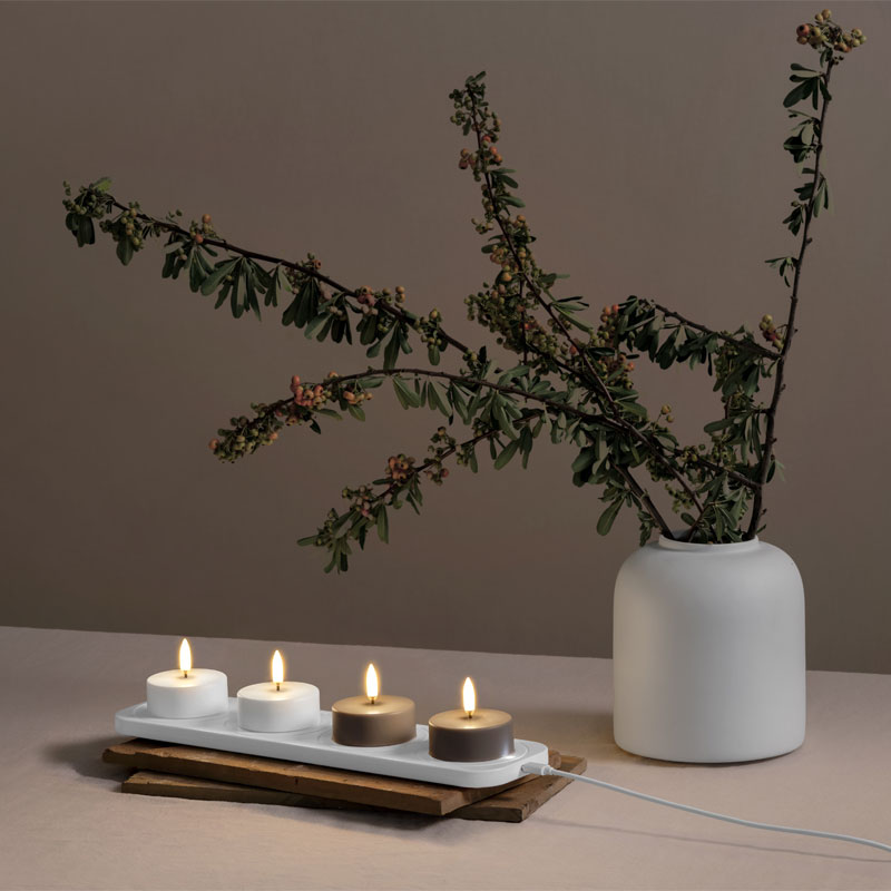 Ladeplattform gjør det enkelt å lade opptil fire lys samtidig. Med lang batteritid, enkel lading og naturtro flamme gir den stemningsfull belysning i hjemmet.