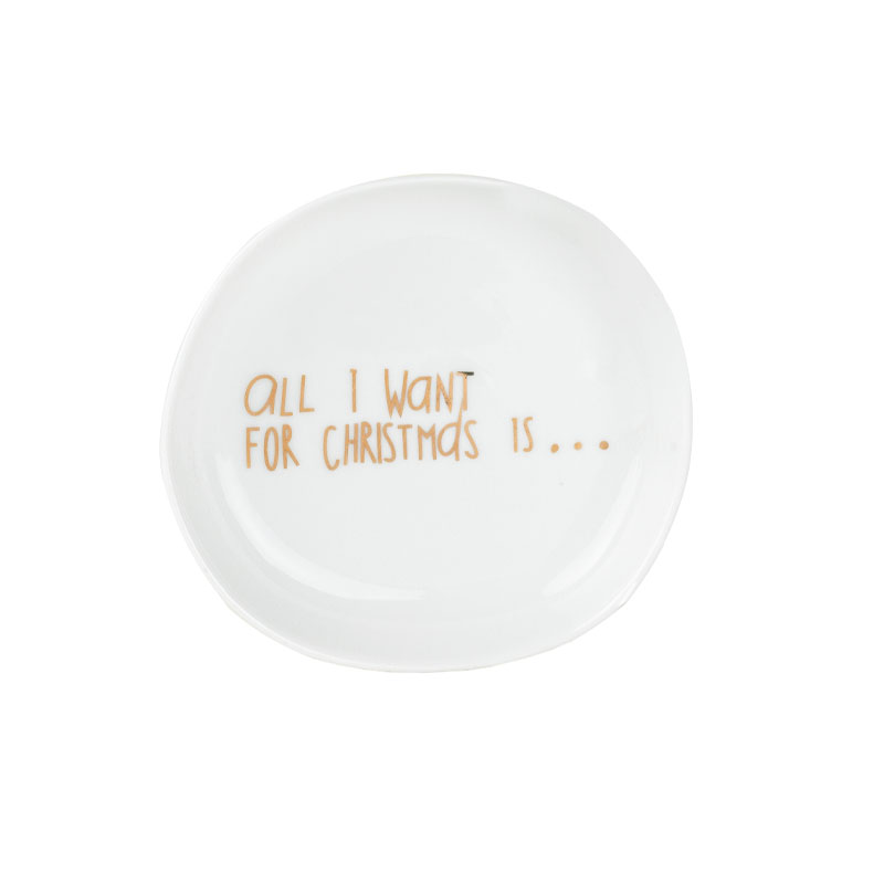 Lite fat med julemotiv “All I want for Christmas” fra Räder — en sjarmerende lite porselensfat med gyllent tekst-dekor. Perfekt til pepperkaker, smågodt eller som dekor.