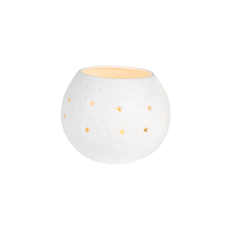 Lysholder med stjerner fra Räder i matt hvit porselen med hullmønster som kaster stjernebilder når lyset tennes. Skaper lun og stemningsfull belysning innendørs