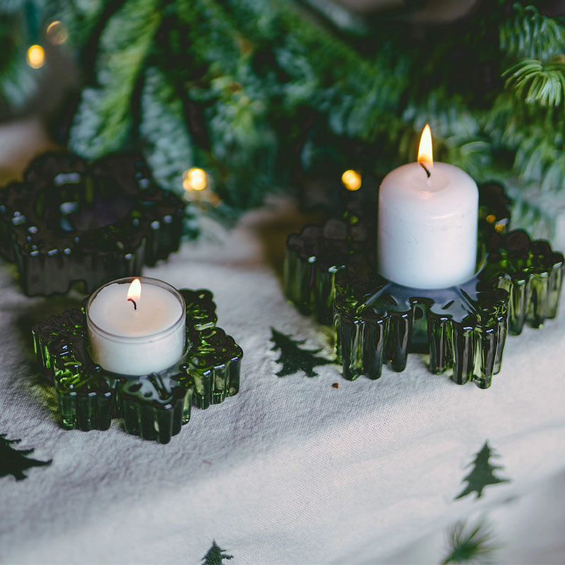 Lysestake snøfnugg – en vakker grønn lysestake formet som et snøfnugg, laget av glass, perfekt til å vise frem lys på en elegant og dekorativ måte i vinterhjemmet.