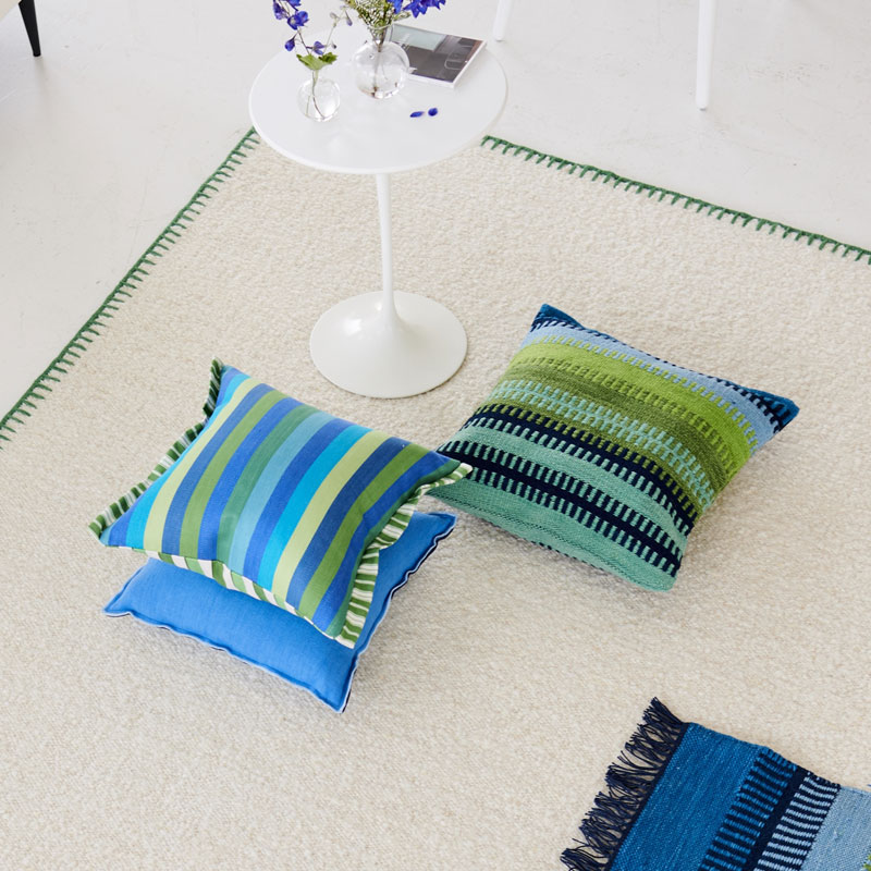 Muturi Cobalt utendørs pute fra Designers Guild er en 50 x 50 cm pute laget for utebruk med slitesterkt vevd materiale i blå og grønne nyanser inspirert av vintage håndvevde tekstiler. Den gir liv og komfort til uteplassen med et klassisk, stripete uttrykk.