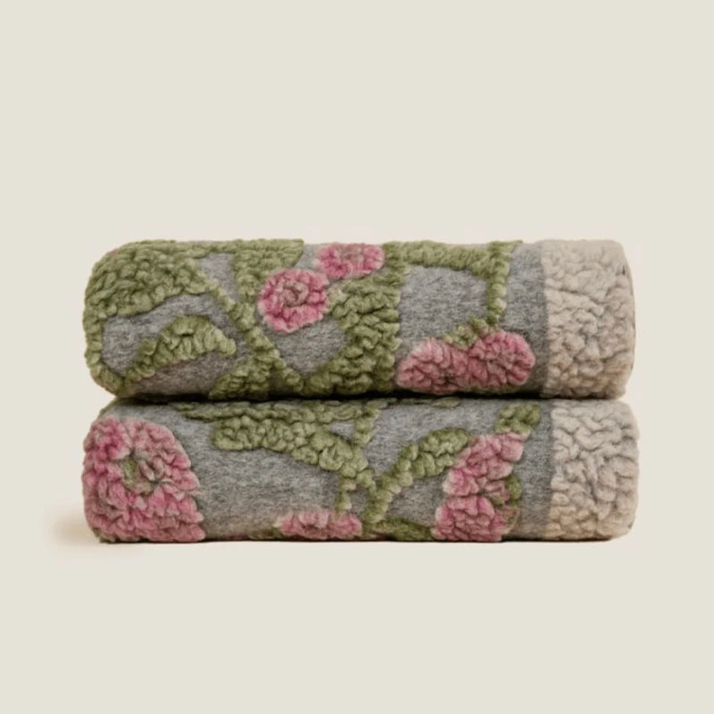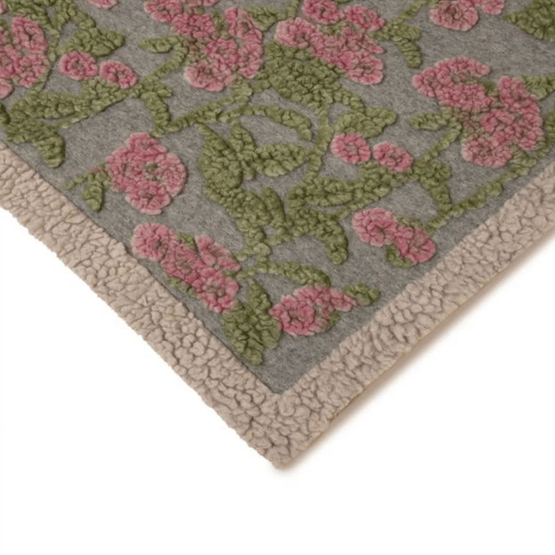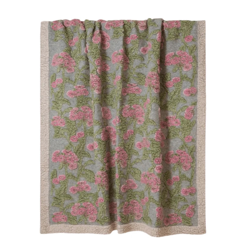 Old Flowers ullpledd fra Frati Home er italiensk design produsert i Toscana. Pleddet har en rolig grå bakgrunn, med søte rosa blomster og grønne blader.