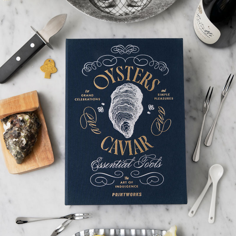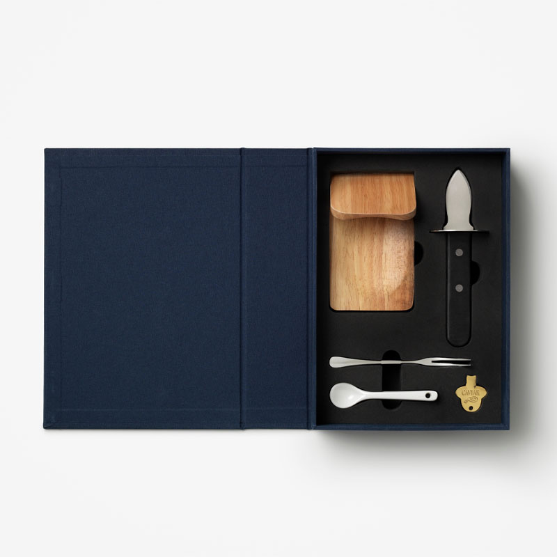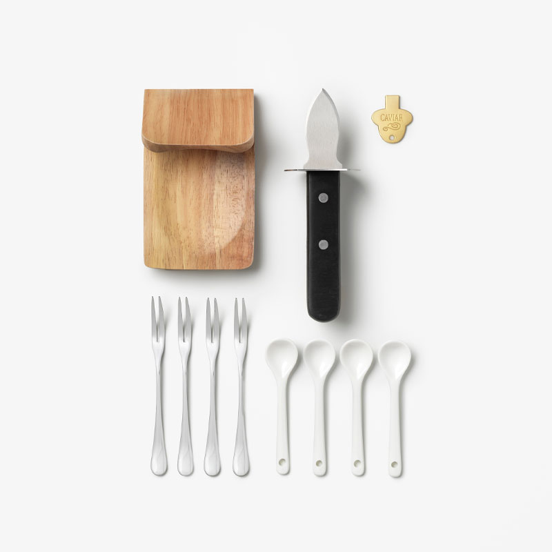 Østers og kaviar redskap fra printworks er et elegant sett for servering av delikatesser, levert i en dekorativ bokformet eske. Settet inneholder nøye utvalgte verktøy i rustfritt stål, tre og keramikk – perfekt for servering av østers