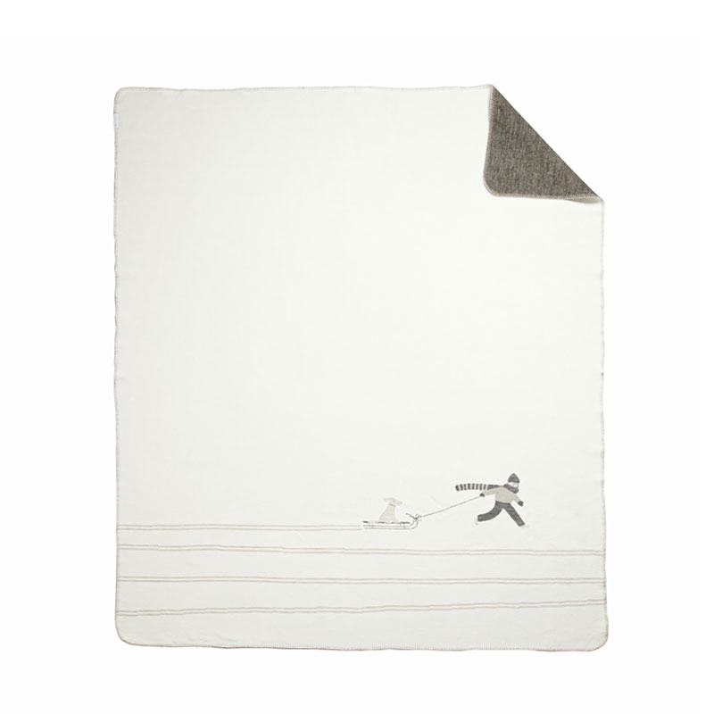 Pledd med vintermotiv fra Räder – mykt og deilig pledd i 65 % bomull og 35 % akryl. Pleddet er dekorert med vintermotiv av en gutt som drar hunden på kjelke. Perfekt for sofaen eller sengen for en lun og vinterlig atmosfære.