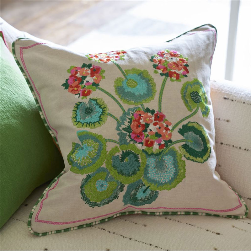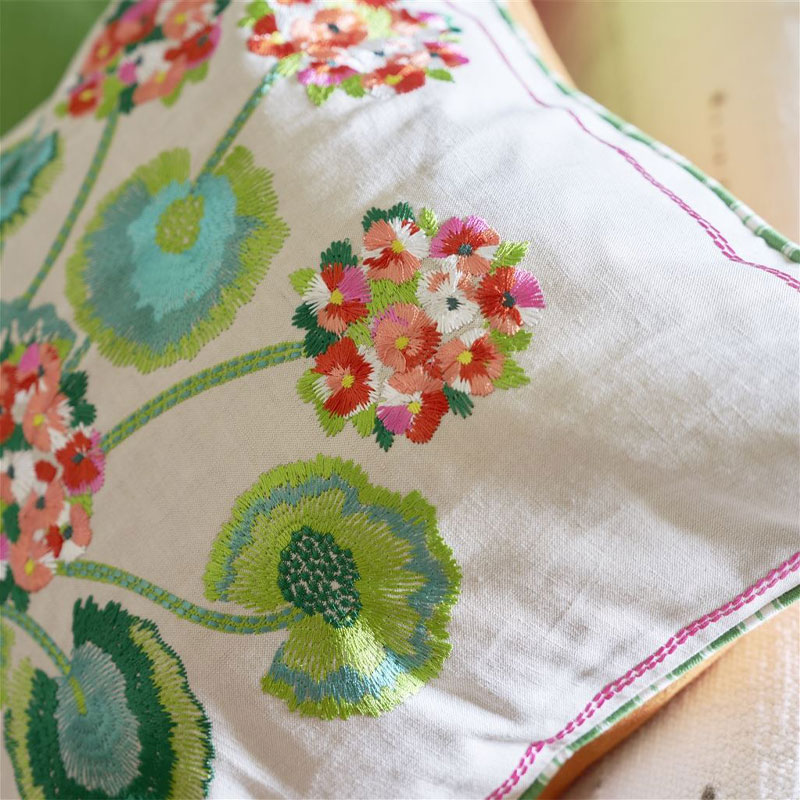 Primevere Fuchsia pute fra Designers Guild er en kvadratisk pute 50 x 50 cm med myk duninnmat. Den har rikt brodert blomsterdesign i nøytrale farger og dekorativ kontrastkant.