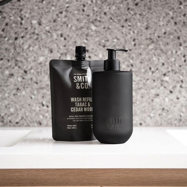 Refill Hånd- og kroppssåpe Black Oud & Saffron fra Smith & Co er en mild og rengjørende refill såpe med en balansert duft av varme, krydrede tobakkstoner med treaktig sedertre. Den renser huden skånsomt samtidig som den etterlater huden myk og velduftende.