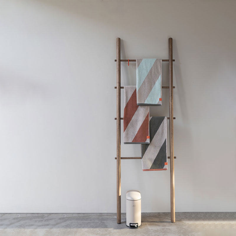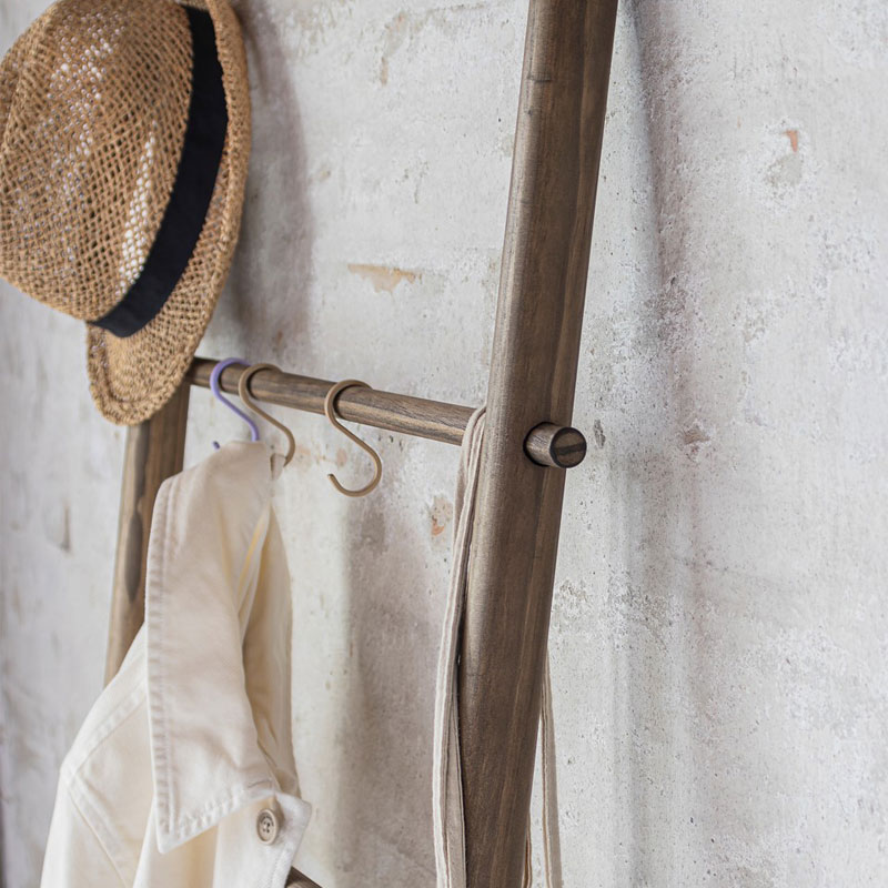 Roots stige fra Mette Ditmer i mørkoljet furu med et enkelt og funksjonelt design. Den fungerer som en fleksibel oppbevaringsløsning til håndklær eller klær, og passer fint inn på bad, soverom eller i garderoben.