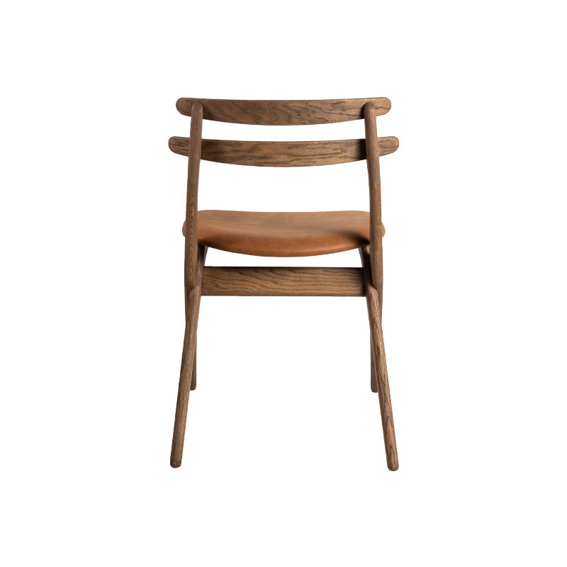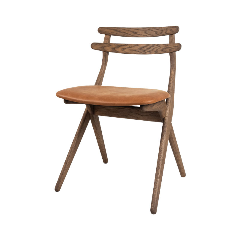 Saks spisestol fra Kristensen og Kristensen er en tidløs stol i heltre eik med antikk brun olje og sete i eksklusivt anilin skinn. Det karakteristiske understellet med kryssende ben gir et lett uttrykk, mens komfort og håndverk står i fokus