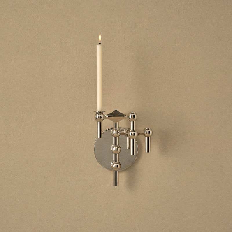 STOFF Nagel vegglysestake i krom er en elegant løsning for å løfte lysestakemodulene opp på veggen og designe din egne vegghengte lysestake. Enten du har én eller flere moduler, gir den et dekorativt og skulpturelt blikkfang som fremhever designet på en unik måte.