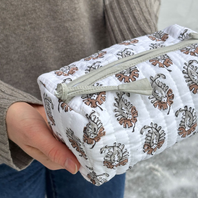 Toalettmappe liten fra Anouska i dekorativt blokkprint i hvit og brun. Den praktiske størrelsen gjør den perfekt til sminke og småting i vesken. Mappen lukkes med glidelås med en dekorativ dusk.