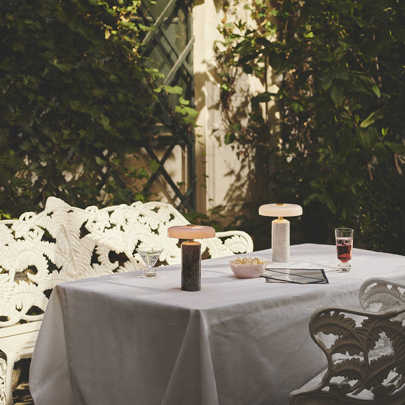 Trip Oppladbar bordlampe fra Design By Us er en elegant, ledningsløs LED lampe med base i polert marmor og munnblåst opalglass som gir et mykt og stemningsfullt lys. Lampen har tre dimmenivåer og lades via en diskret ladestasjon i marmor, som gjør den like dekorativ når den står på lading. Trip er perfekt på stuebordet, soverommet eller som en del av borddekkingen.
