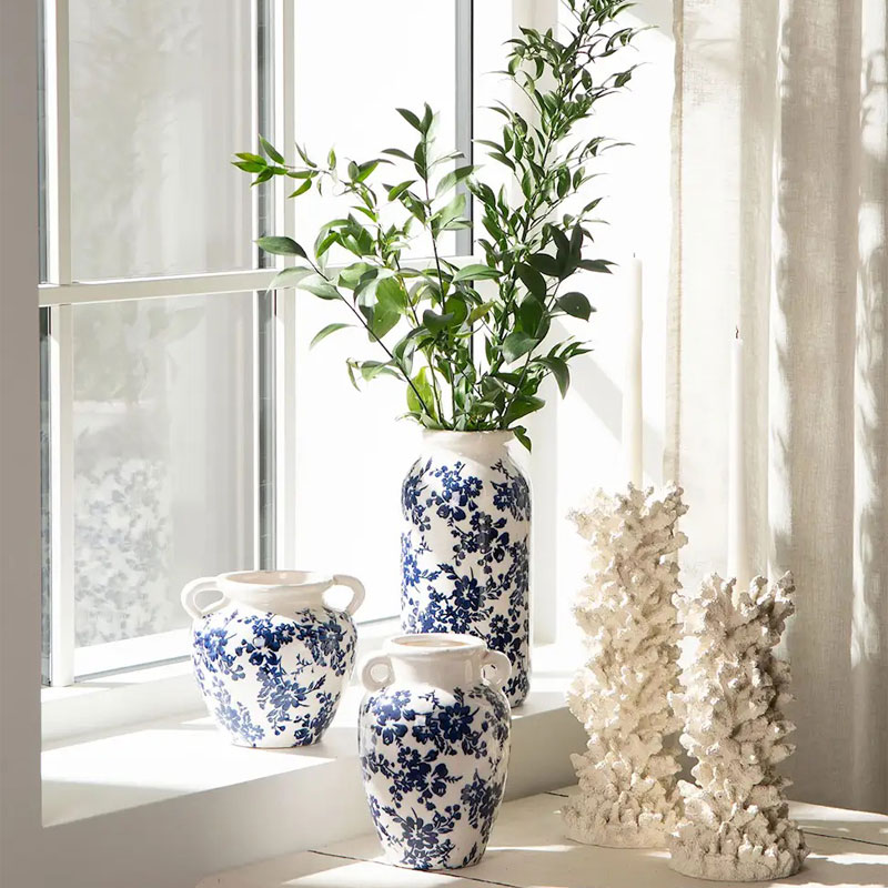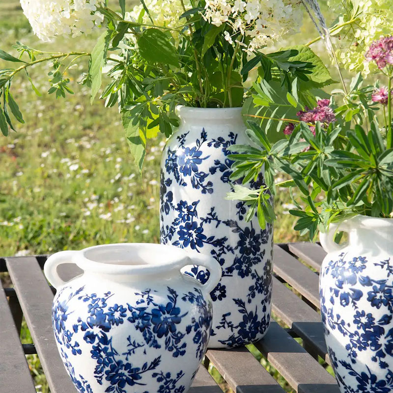 Vase Arild fra Alot er en dekorativ vase i keramikk med naturhvit bakgrunn med små blå blomster. Vasen er 22 cm høy og gir et klassisk, sommerlig uttrykk til både inne- og utemiljø.