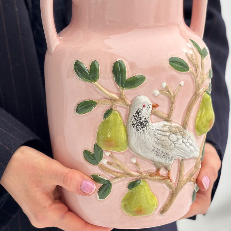 Vase med pærer fra EDG er en håndlaget ferskenfarget keramiskkvase med pærer som gir karakter til hjemmet.