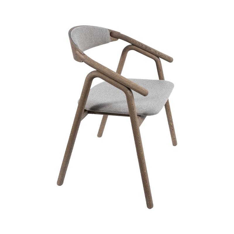 Veifa spisestol fra Kristensen og Kristensen er en elegant stol i heltre eik med grå-run olje og trukket i Wooly tekstil i beige. Den buede ryggen omslutter kroppen og gir god komfort, mens de myke linjene skaper et lett og tidløst uttrykk